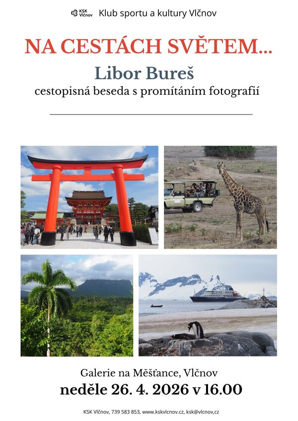 Srdečně Vás zveme tuto neděli 26. dubna v 16.00 hodin do Galerie na Měšťance, kde proběhne cestopisná beseda a promítání fotografií s panem Liborem Burešem s názvem Na cestách světem. Pan Bureš procestoval velký kus světa a seznámí nás právě s některými ze svých cest. V neděli bude také naposled k vidění jeho výstava fotografií. Přijďte tedy cestovat světem díky jeho vyprávění a promítání.